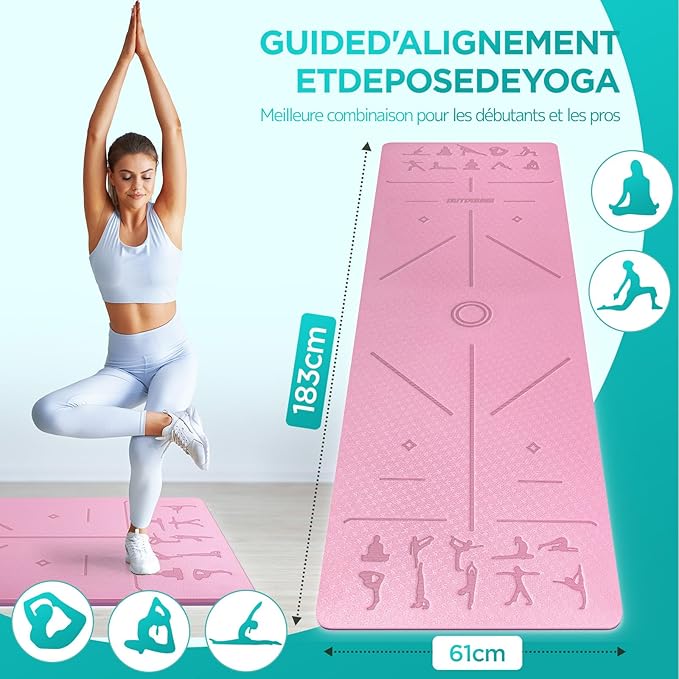 - Points forts : surface innovante en caoutchouc naturel + PU, repères d’alignement intégrés, adhérence exceptionnelle même en hot yoga.